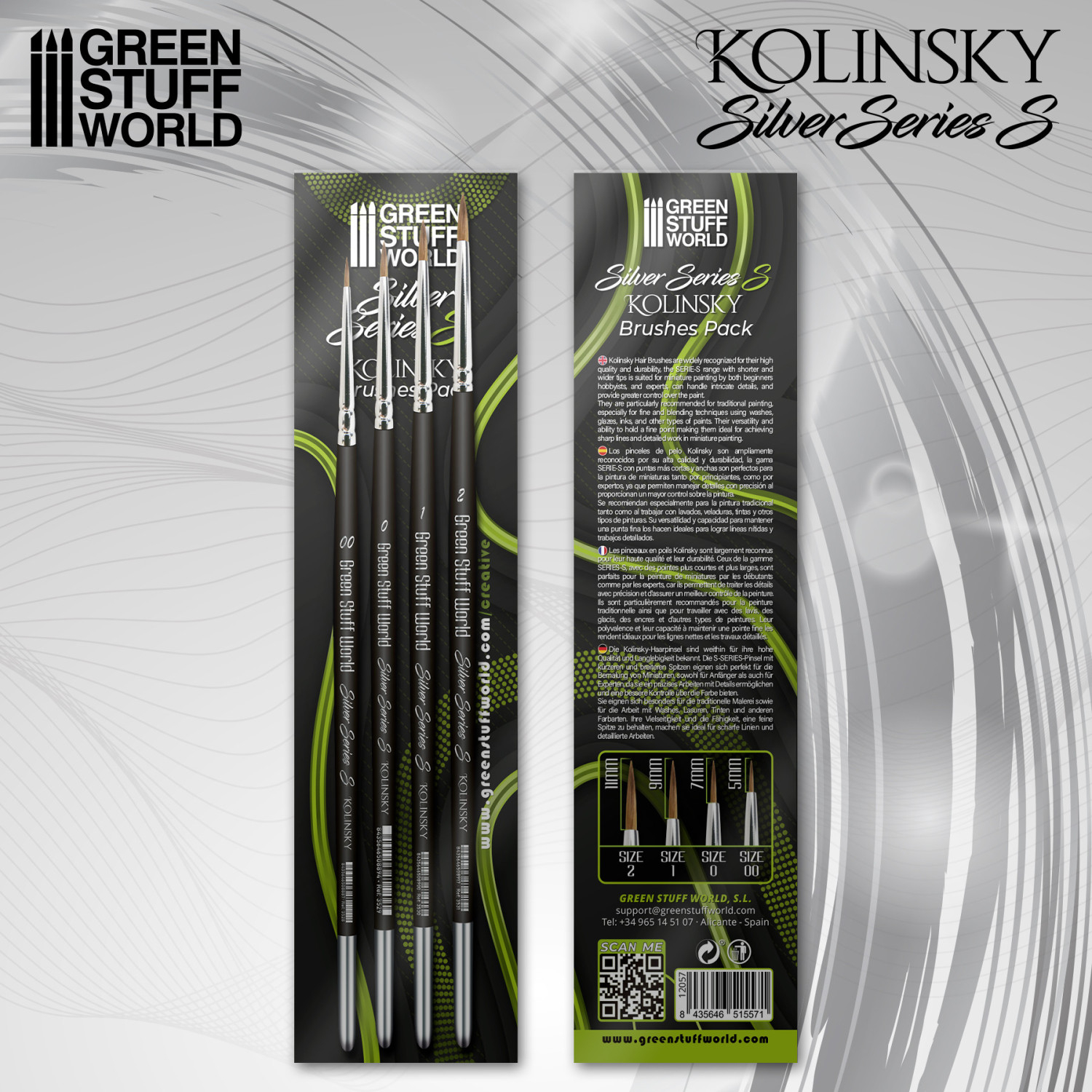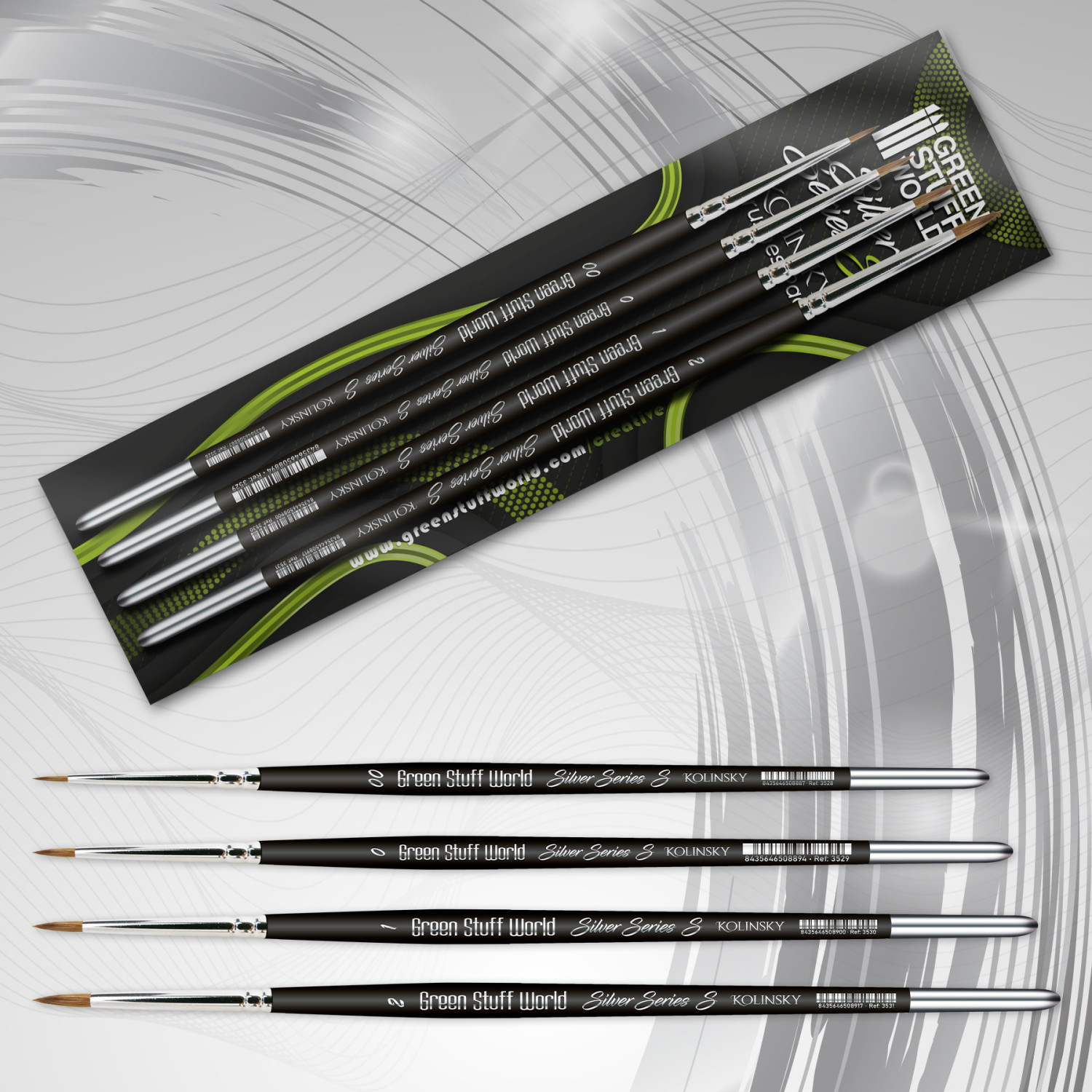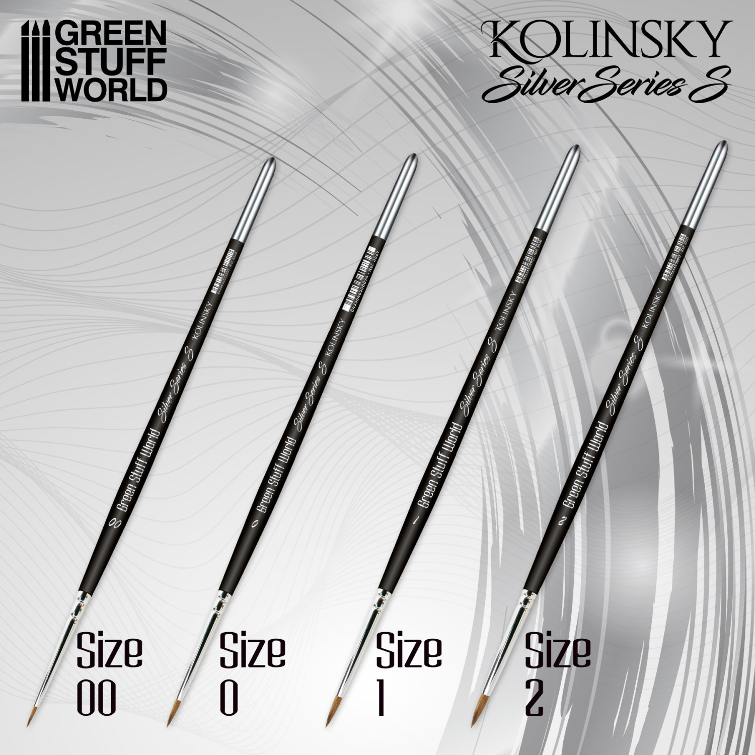 Set de pensule Kolinsky Silver Series (S) de la Green Stuff World, conceput pentru pictura de miniaturi. Pensulele din seria S au vârfuri mai scurte și mai late, oferind control sporit asupra vopselei și fiind potrivite atât pentru începători, cât și pentru utilizatori avansați. Sunt recomandate pentru pictură tradițională, lavisuri, glazuri, cerneluri și alte tehnici care folosesc medii fluide.