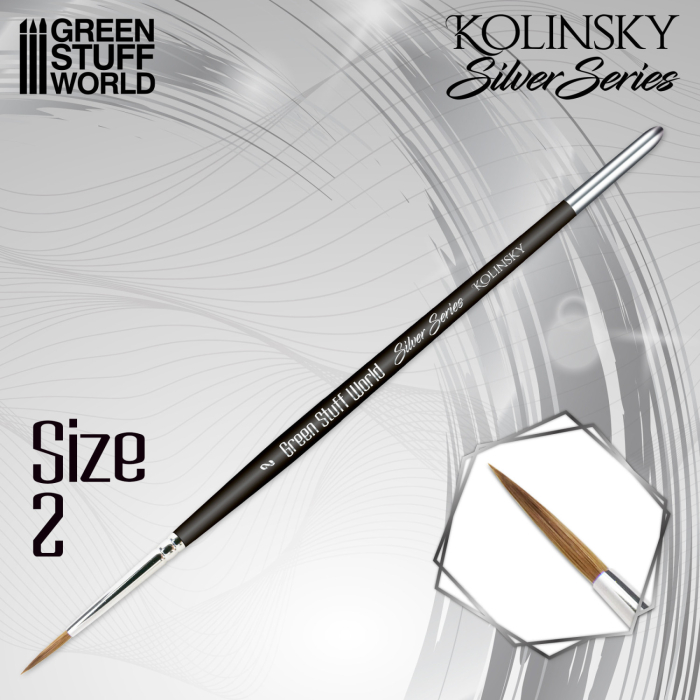 Pensulă Kolinsky Silver Series de la Green Stuff World, realizată manual, cu mâner din lemn, virolă din alamă și vârf din păr natural Kolinsky. Este recomandată pentru vopsele acrilice pe bază de apă și pentru tehnici fine precum lavisuri, blending, layering și degradări. Nu este recomandată pentru dry brush, single stroke sau vopsele în ulei.