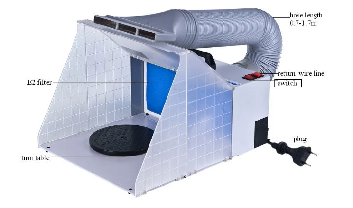 Ideală pentru lucrări cu aerograf, spray-uri acrilice, vopsele enamel sau lacuri. Filtrul intern se poate înlocui ușor, iar cabina este potrivită pentru piese de dimensiuni medii.